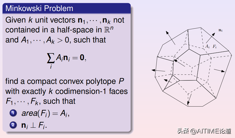 如果在三维空间中给定一个凸多面体,我们知道每个面的面积和法向量(有向面积),并且有向面积总和为0,我们可否将这个凸多面体的形状确定下来?这个问题被称为是Minkowski问题。Minkowski证明了解的存在唯一性。