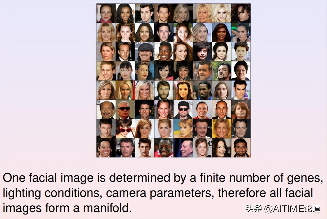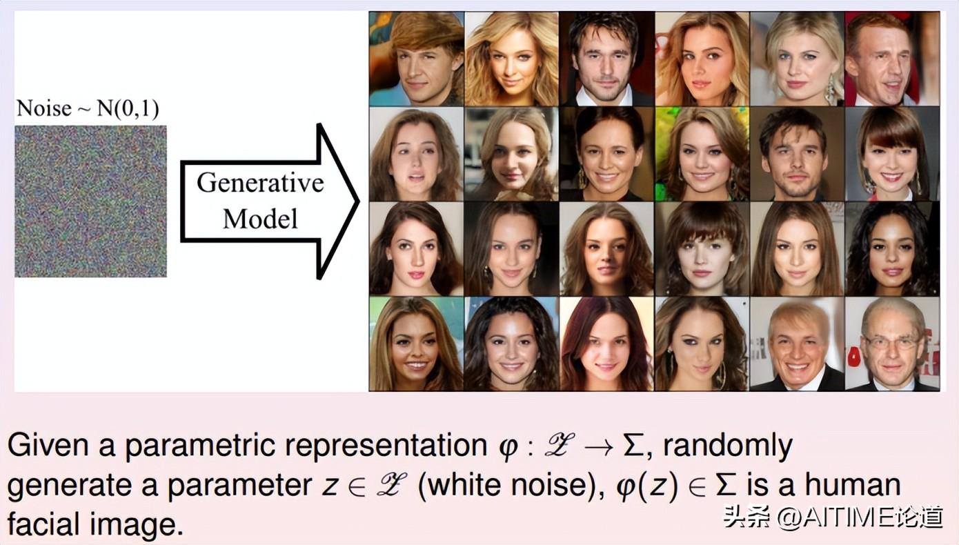 在工程实践中,我们经常要生成许多人脸图像。这里对应的概念就是人脸图像,每张图像包含上百万像素,因此图像空间维数很高。在图像空间中的每个点代表一幅图片,所有人脸图像构成点云,即弯曲的数据流形。经过大幅度的降维,我们将人脸图像数据流形映射到隐空间上,不同类型的人脸表示成流形上不同的概率分布,深度生成模型的核心就是学习人脸图像的概率分布。