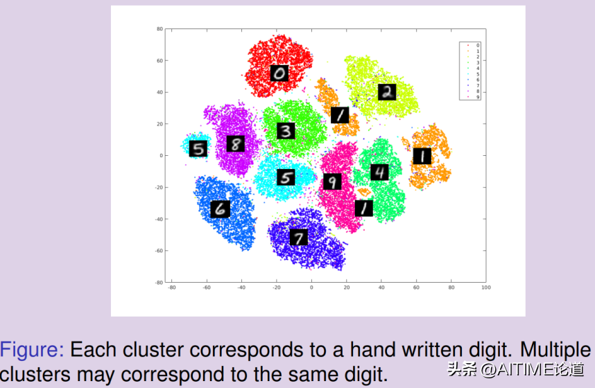 深度学习的第一步就是将这个曲面打到二维平面上,把每一个图像变成一个特征向量,从而实现了降维。手写体数字从0到9共有10个数字,所以其在二维隐空间或者特征空间中有10个团簇。如上图中的右帧,每个团簇用不同的颜色来表示,各自代表一个手写体数字。每个手写体数字代表不同的概率分布,实际上在二维曲面上的分布是不均匀的。