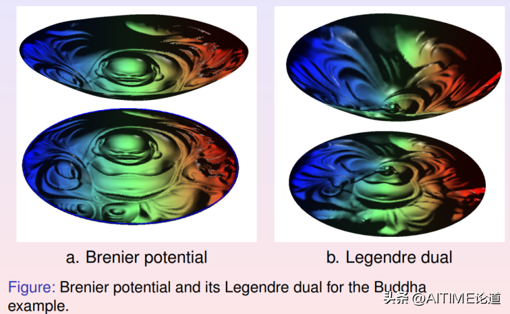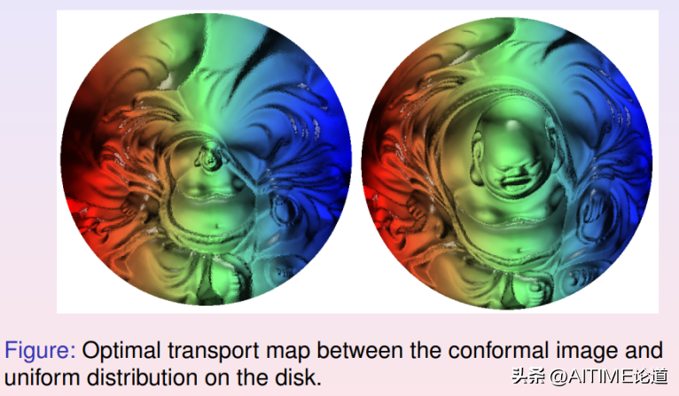 基于我们的定理,我们可以设计算法求解最优传输映射。黎曼映射将弥勒佛曲面映射到平面单位圆盘上,从而将曲面的面元前推到圆盘上,得到黎曼映射诱导的测度。我们计算从圆盘上的勒贝格测度到黎曼映射诱导的测度之间的最优传输映射,左帧显示了相应的Brenier势能函数;其逆映射也是最优传输映射,其Brenier势能函数显示在右帧,两个势能函数互为勒让德变换。