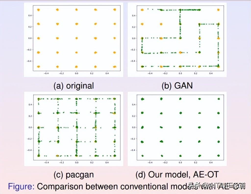 如(a)帧所示,我们设计了平面上的一个概率分布,分布的支撑集显示为橘黄色的点,每一个点代表一个模式(mode)。GAN模型生成的样本用绿色的点来表示。在(b)帧中,GAN模型生成的绿色样本覆盖了一些橘黄色的点,但是依然有一些橘黄色的点没有被覆盖,这就是模式坍塌现象。在(c)帧中,所有橘黄色的点都被pacgan生成的绿色样本覆盖,即pacgan没有出现模式坍塌,但是它也生成了很多绿色样本介于橘黄色的点之间,这就是模式混淆现象。