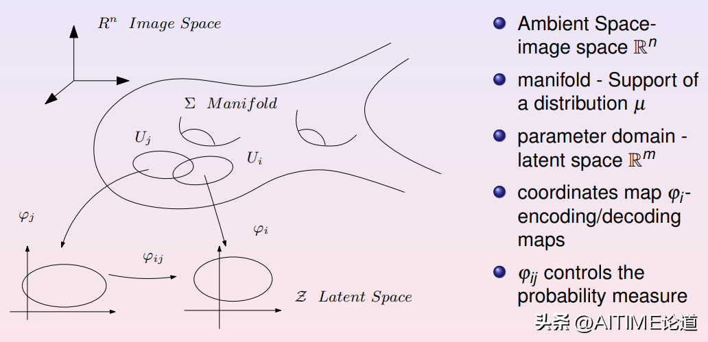 我们可以用数学语言来描述,背景空间是一个图像空间,图像空间的维数就等于每张图像上像素的个数。某一自然概念对应的数据集就是图像空间中的一个点云,这个点云构成一个低维的流形,被称之为数据流形。我们在数据流形上选取一个开集,并通过编码映射到特征空间(隐空间)之中。