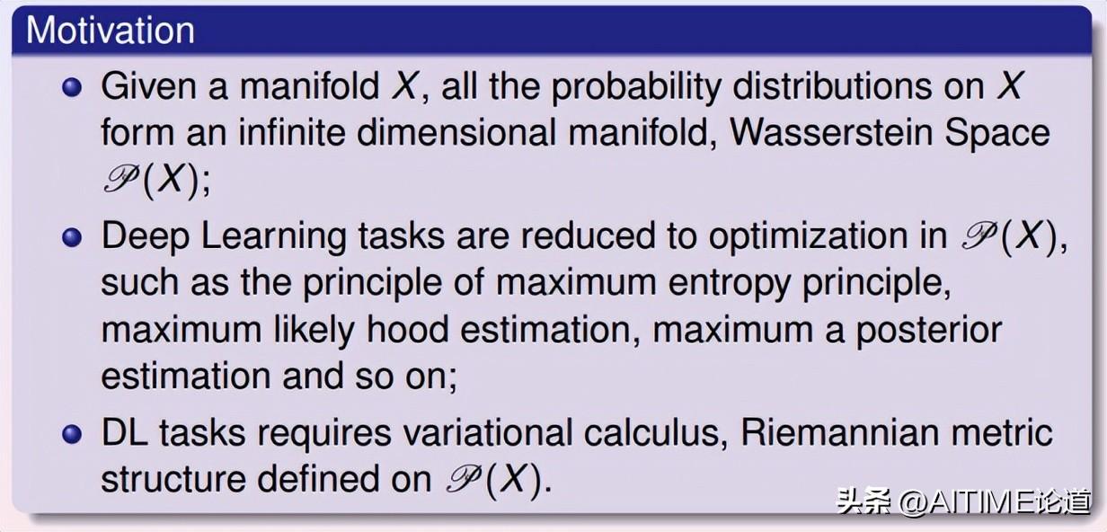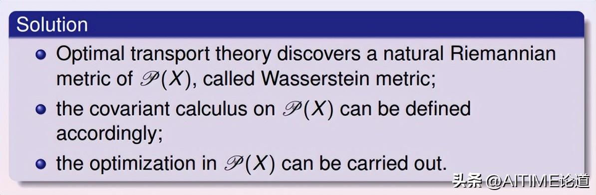 最优传输理论框架如图所示:我们考察一个黎曼流形上所有可能的概率分布,所有可能的概率分布构成一个无穷维的空间,即Wasserstein空间。深度学习的本质是在Wasserstein空间中优化,挑选出最佳的概率分布,使其满足某些观察(例如期望)并且优化某些能量(例如最大熵值)。
