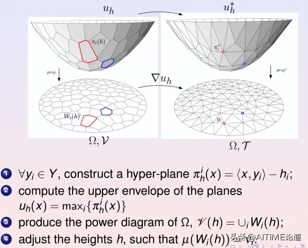 我们用经典的计算几何算法来求解蒙日-安培方程。在实际深度学习应用中,给定的目标概率分布都是离散的,可以表示成狄拉克概率分布之和。