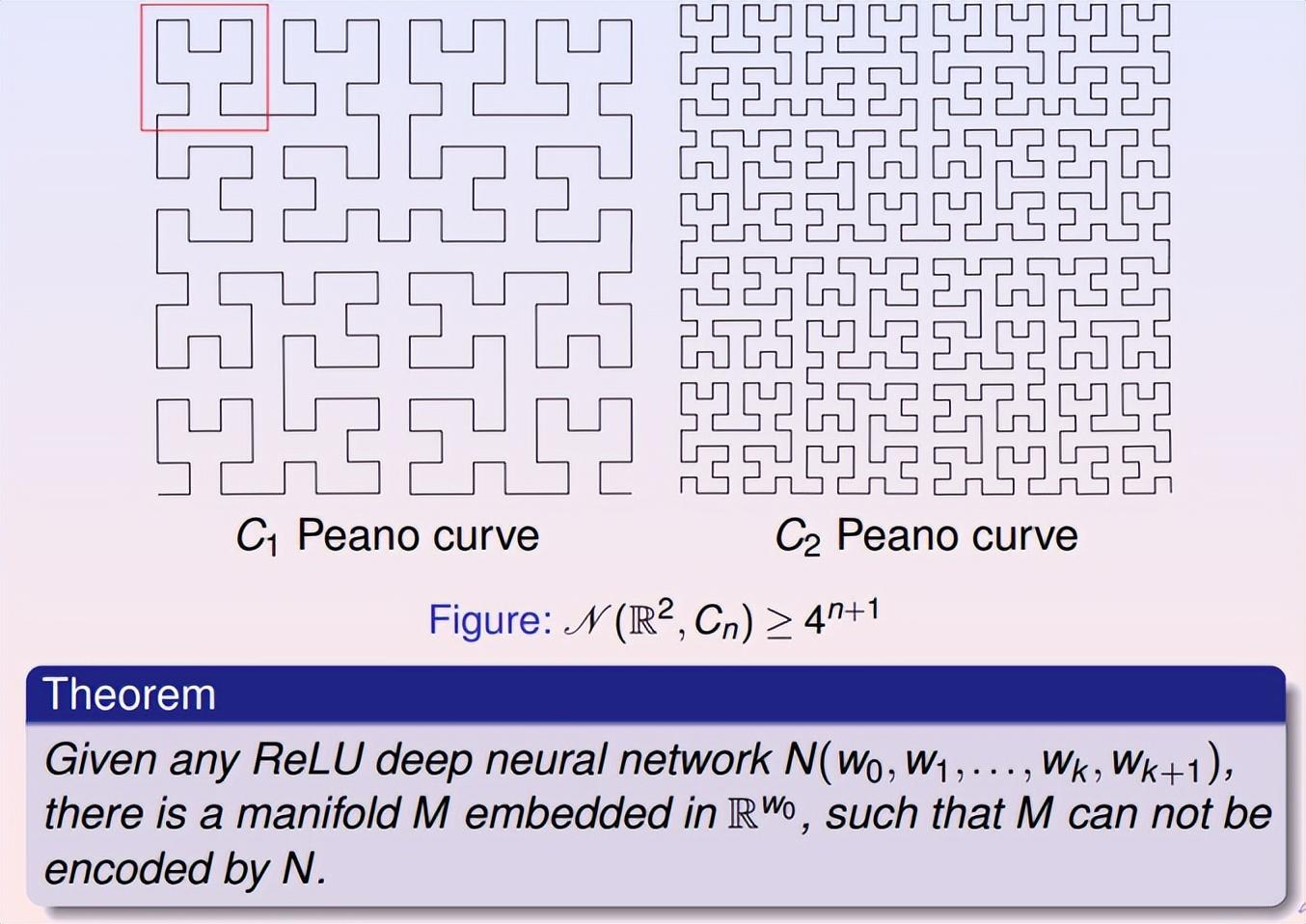 如上图,我们可以递归定义的Peano曲线,每递归一层,其空间复杂度就会乘以4。通过Peano曲线,我们可以构造具有任意复杂度的流形。我们可以用这种流形来检测当前深度神经网络的学习能力。