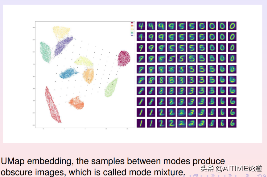 我们知道深度学习中的生成模型,模拟的是人类的想象力。我们在特征空间随便找一个采样点并映射回数据流形上,流形上每个点就是一幅图像,由此我们得到了想象出来的一幅图像。采样点需要精确选取。如上图所示,我们在特征空间设置一个10*10的采样矩阵,每个采样点对应右侧的一幅图像。我们可以看到如果采样点落在概率分布的支集(support)之内,生成的数字图像非常清晰;如果采样点落在支集之外,生成的数字图像比较模糊,并且并介于两个数字之间,难以辨认。因此在我们想象的时候,采样点需要落在有意义的区域之内,即落在支集之内;采样点落在支集之外,所造成的模糊现象被称为模式混淆。