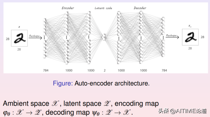 这里我们考察最简单的编码解码网络:自动编码器。以刚刚我们提到的手写体数字识别为例,编码器的输入样本是28*28的手写体图像,输出是复制的相同图像,损失函数是使生成图像与输入图像的距离。我们设计两个对称的网络,前面网络是编码器,后面网络是解码器,中间的瓶颈层代表了隐空间,瓶颈层节点的个数是隐空间的维数。前面网络将输入图像从784维降维两维,实际上相当于一个编码映射,后面网络从两维变回784维,相当于解码映射。训练的目的是得到恒同变换,即编码映射和解码映射彼此互逆,由此编码和解码映射是从数据流形到特征空间的拓扑同胚。