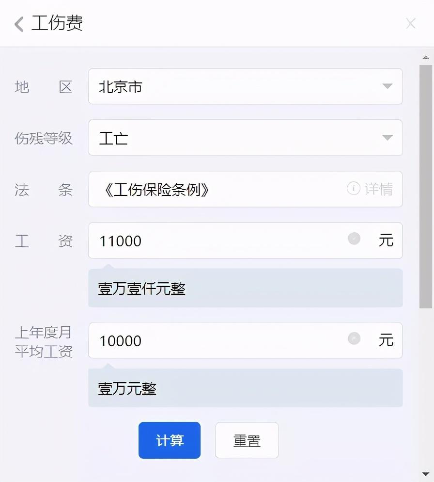 工伤费可以选择地区和伤残等级,伤残等级分为工亡、一级伤残、二级伤残至十级伤残,输入相应金额即可计算。