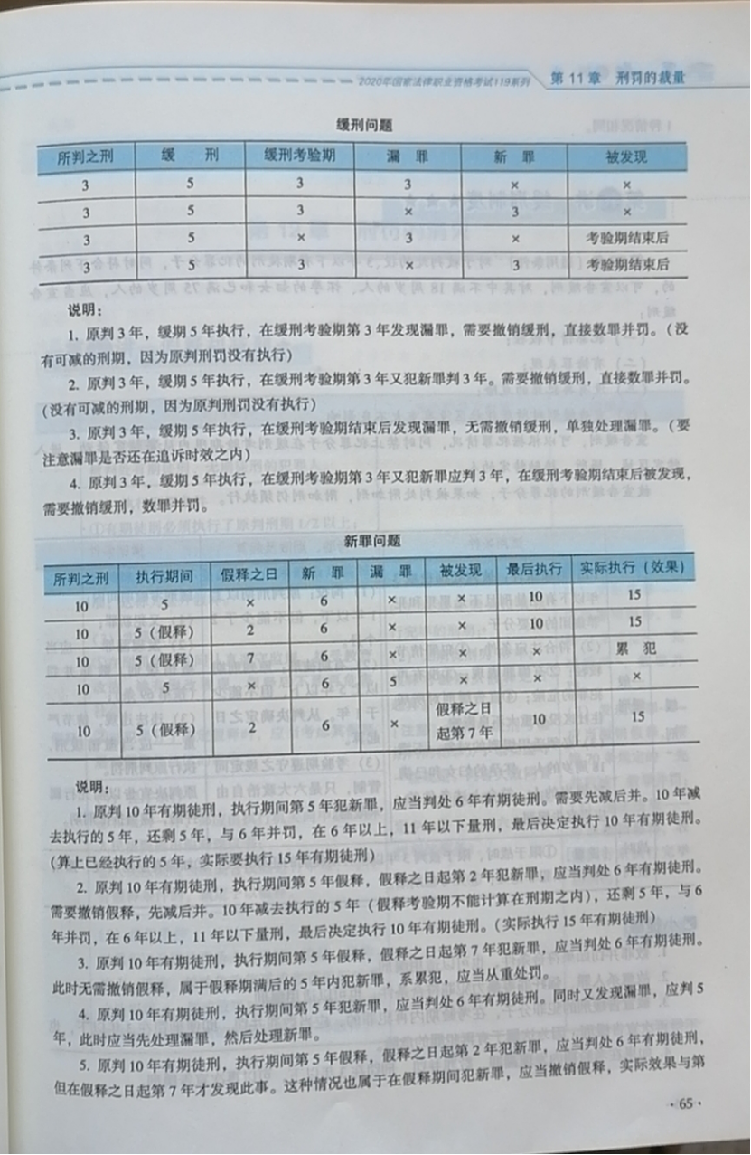罗翔:罗翔的书也是表格为主,但是他的内容比徐光华的要精炼许多,对于部分知识点还有总结性的图表,例如下图所示的缓刑、新罪问题等。这样的总结对于记忆是比较有帮助的,因为有一个整体性的概览,另外一个亮点是部分知识点有对比表(抢劫、抢夺、盗窃等)。罗翔的书共136页,对于观点展示也没有专门的总结。