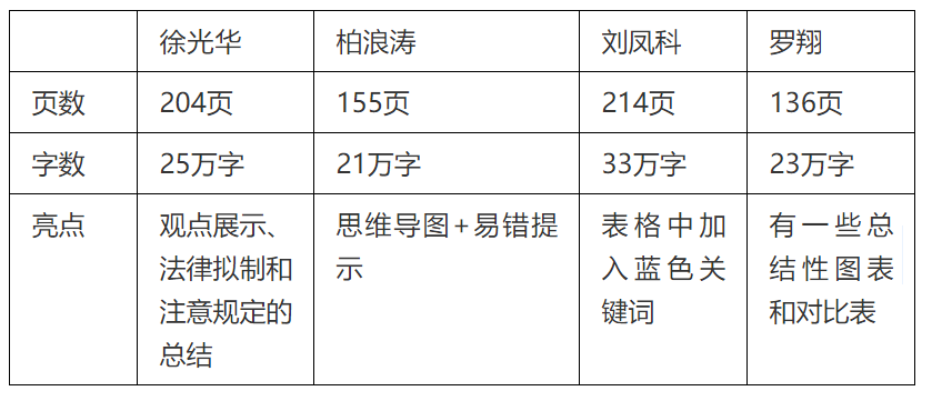 3、刘凤科:刘凤科的书也是表格总结,他的亮点在于大知识点和详细讲解之间加入了蓝色字体的关键词,更加有利于记忆和起到内容的提示作用。记住关键词,再进行一定的扩充就比较容易记住整个知识点了。