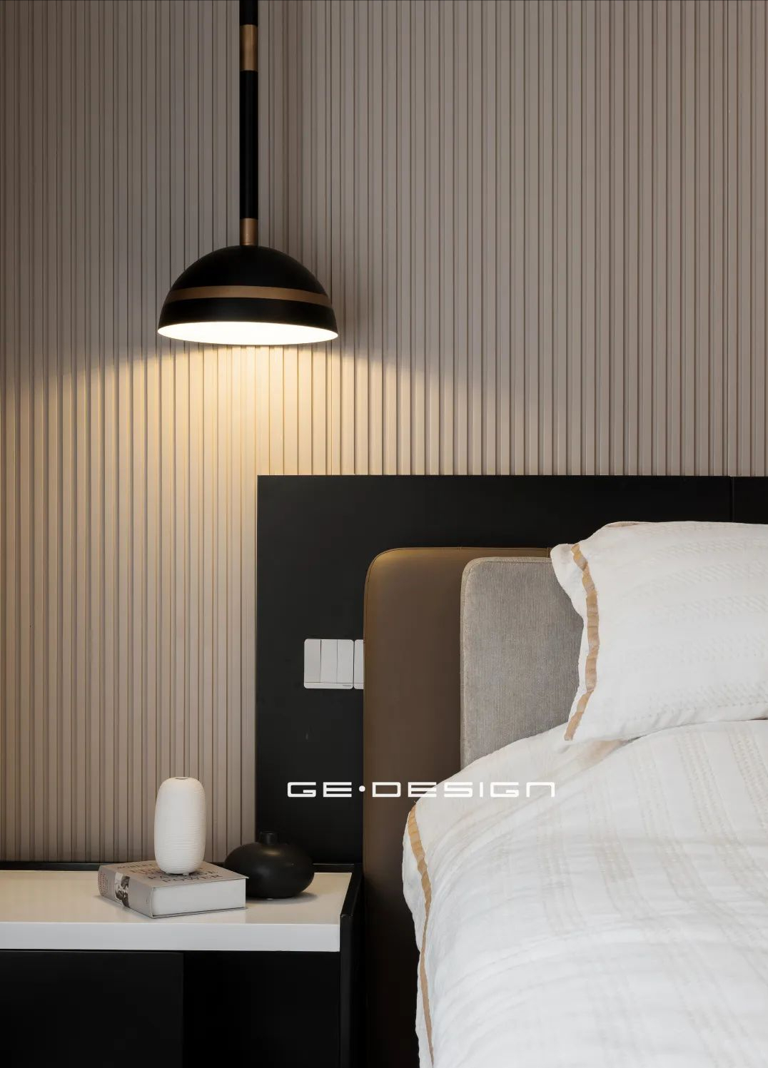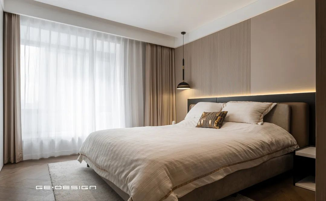 主卧整体用色也比较柔和,除了纯净的白、温和的木色,再加上局部酷雅的黑,再无其他。