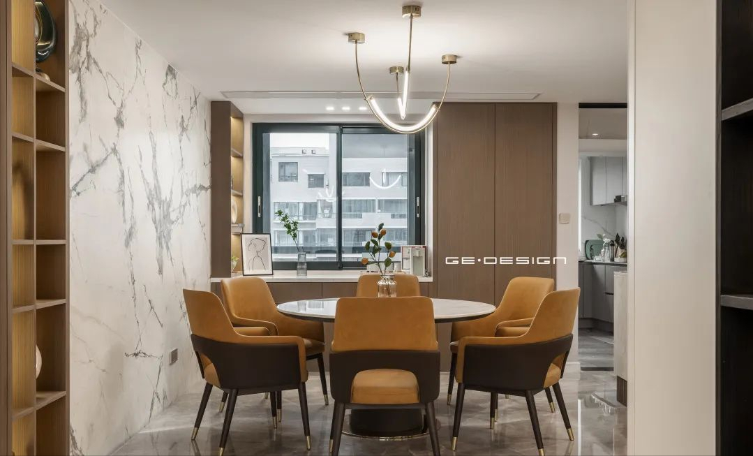 从玄关处摒弃风尘,不过数步便来到餐厅区域。大型圆桌搭配棕色短绒靠椅,给人极其温馨的视觉体验。