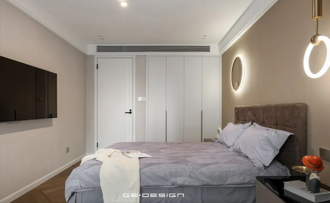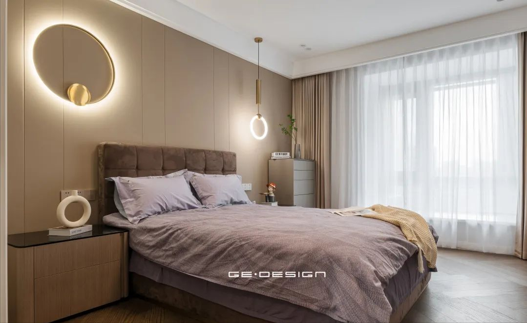 长辈房间的氛围更加恬淡安静,为了适应老人的视力情况,卧室多了一些灯光装饰。圆形灯饰优雅大方,光线柔和不刺眼,尽可能为老人带来良好的居住体验。