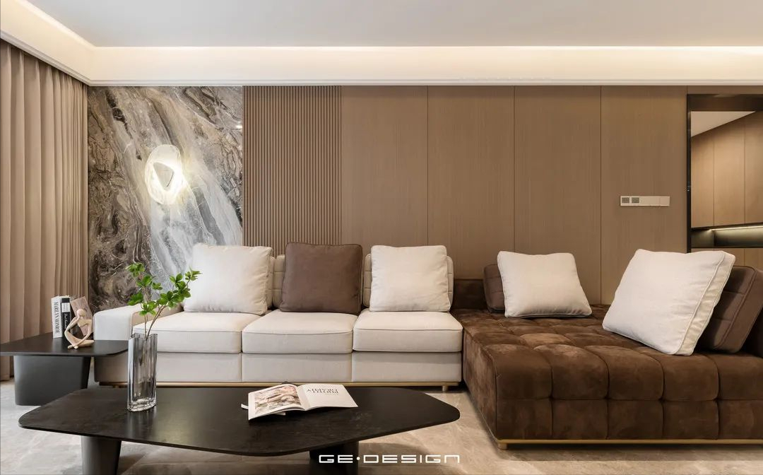 电视墙整体也很干净利落,内嵌灯带的设计更显空间质感。沙发背景墙多了一点层次,石材+木格栅拼接,营造出室内的清雅与温暖。