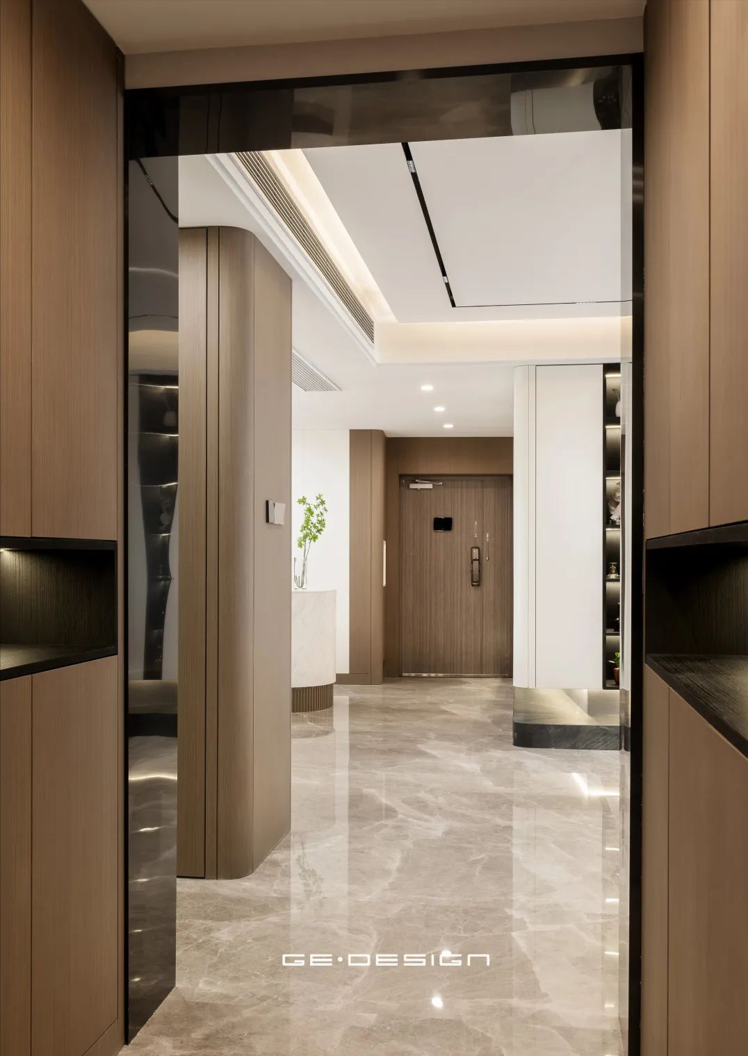原始户型有一道玄关墙,我们将其拆除,在墙面做了定制的玄关柜。由于入户处朝向有点倾斜,定制柜+下翻板的组合方式,既满足了日常进出的收纳需求,又提供了合适的装饰平台。