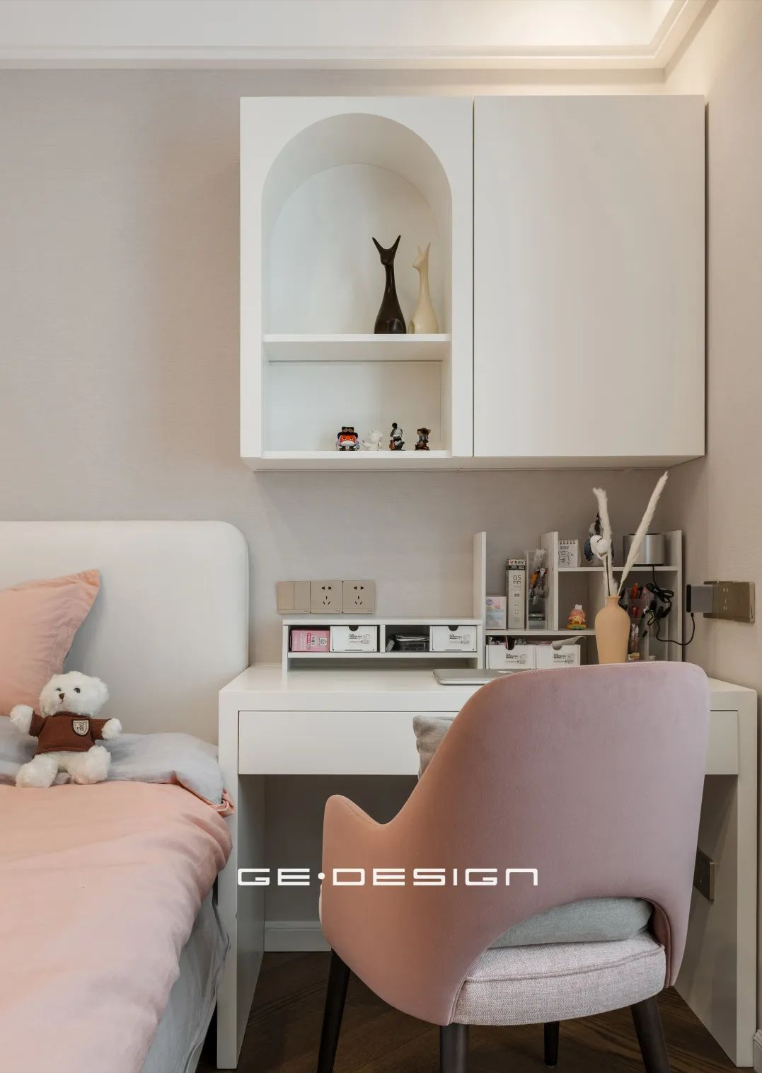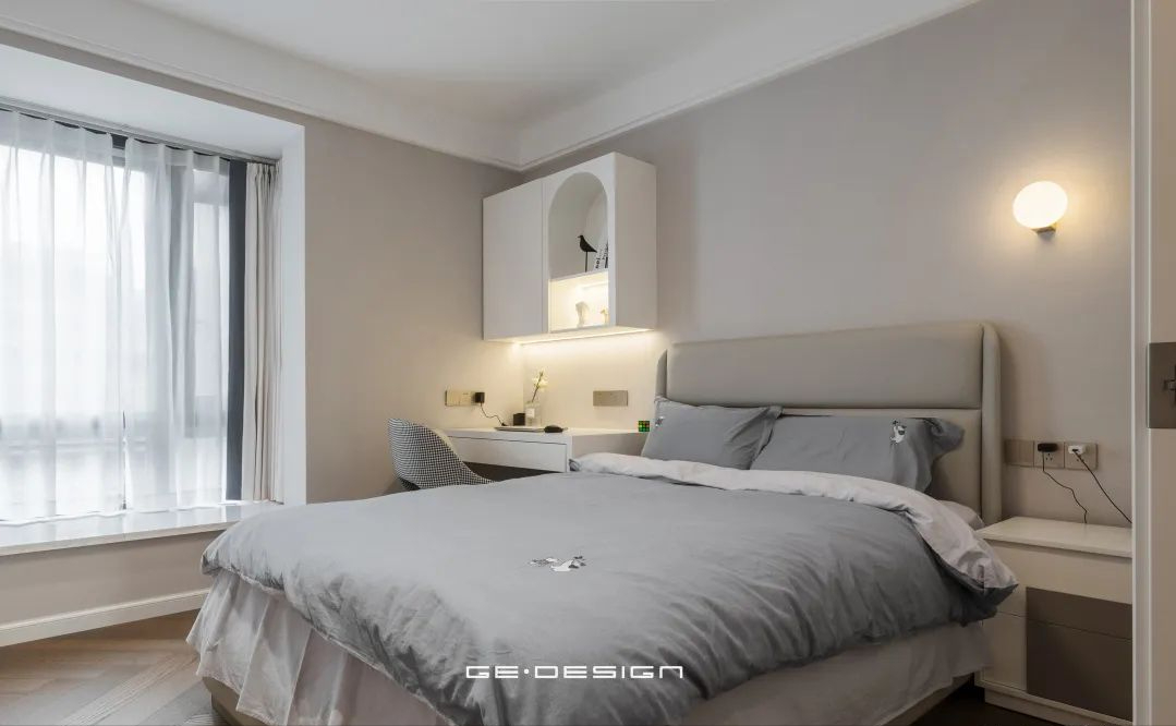 在这里没用对称式的床头柜,临近飘窗处放了书桌+靠椅,顶部做了拱形开放格和封闭柜体,可以成为书籍和装饰物的存放区。