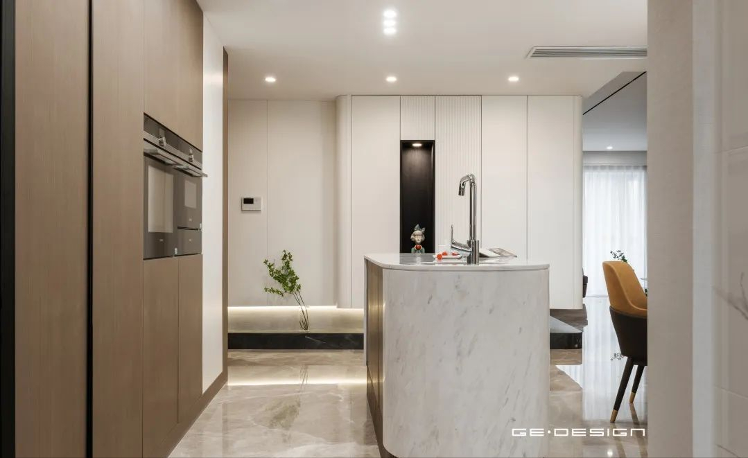 椭圆形中岛台拥有整洁干净的台面,再加上内嵌单槽的设计,一般的果蔬清洗、西厨烘焙都可以在这里完成。