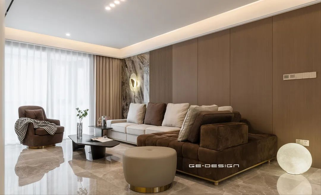 米色与咖色拼接的多人位珊瑚绒沙发与单人沙发、单人凳组合,充分满足一家三代的居住需求。底部统一采用了金属镶边,更显空间的清爽明亮。
