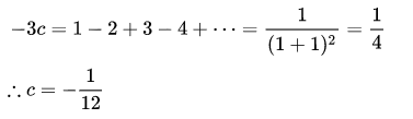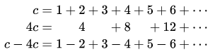 正如公式所示,拉马努金把这个系列作为常数 c 减去c的4倍,要得到这样一个级数:1- 2 + 3 - 4 +····