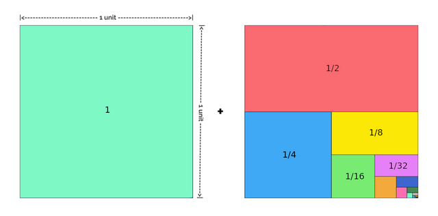 如图所示,我们有两个方块(每个方块1平方米),一个是整体,其面积代表数列的第一项,即1,第二个正方形代表所有后面项的总和。如你所见,我们已经将第二个正方形分成了不同的部分:红色= 1/2,蓝色= 1/4,黄色= 1/8,绿色= 1/6等等。因此,以类似的方式,即使我们把第二个正方形分成无限多个部分,它们的面积之和仍然是1平方米。这就是这个级数所表示的,所以我们得到了答案2。