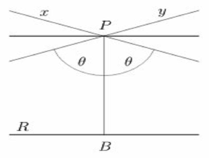 双曲几何中,至少有两条不相交的直线,且都通过P点,并不与R相交。