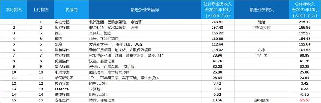 实力媒体凭借北汽集团、巴黎欧莱雅、赛诺菲等新业务居首位,品迪暂获香奈儿等新业务冲到第三名,蔚迈获得小米中国等新业务紧跟其后。
