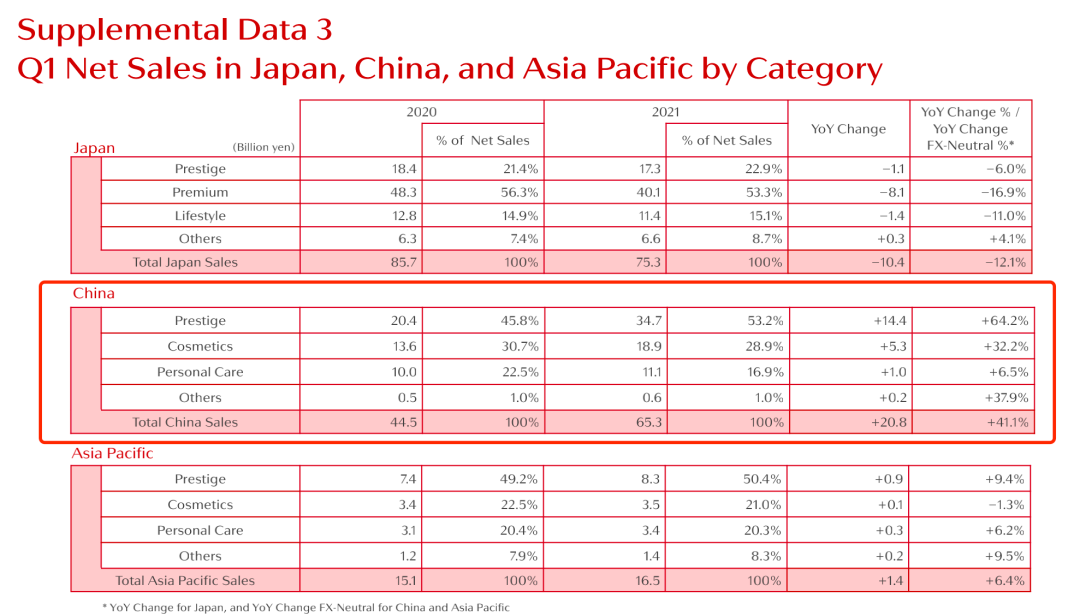 财报指出,2021年第一季度,护肤品牌继续成为资生堂集团的增长引擎,实现了同比两位数的增长。同时,护肤品类占集团整体业务的比例已达到64%,比去年增长了2.7个百分点。