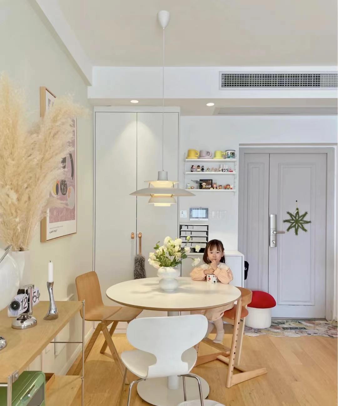餐厅并没有摆放长条状靠墙的餐桌,而是用一个小圆桌代替,小圆桌好移动,如果觉得桌子有一些挡住过道或者挡住去收纳柜里拿东西时,可以随意的把小圆桌移动一下,比长条桌方便许多。