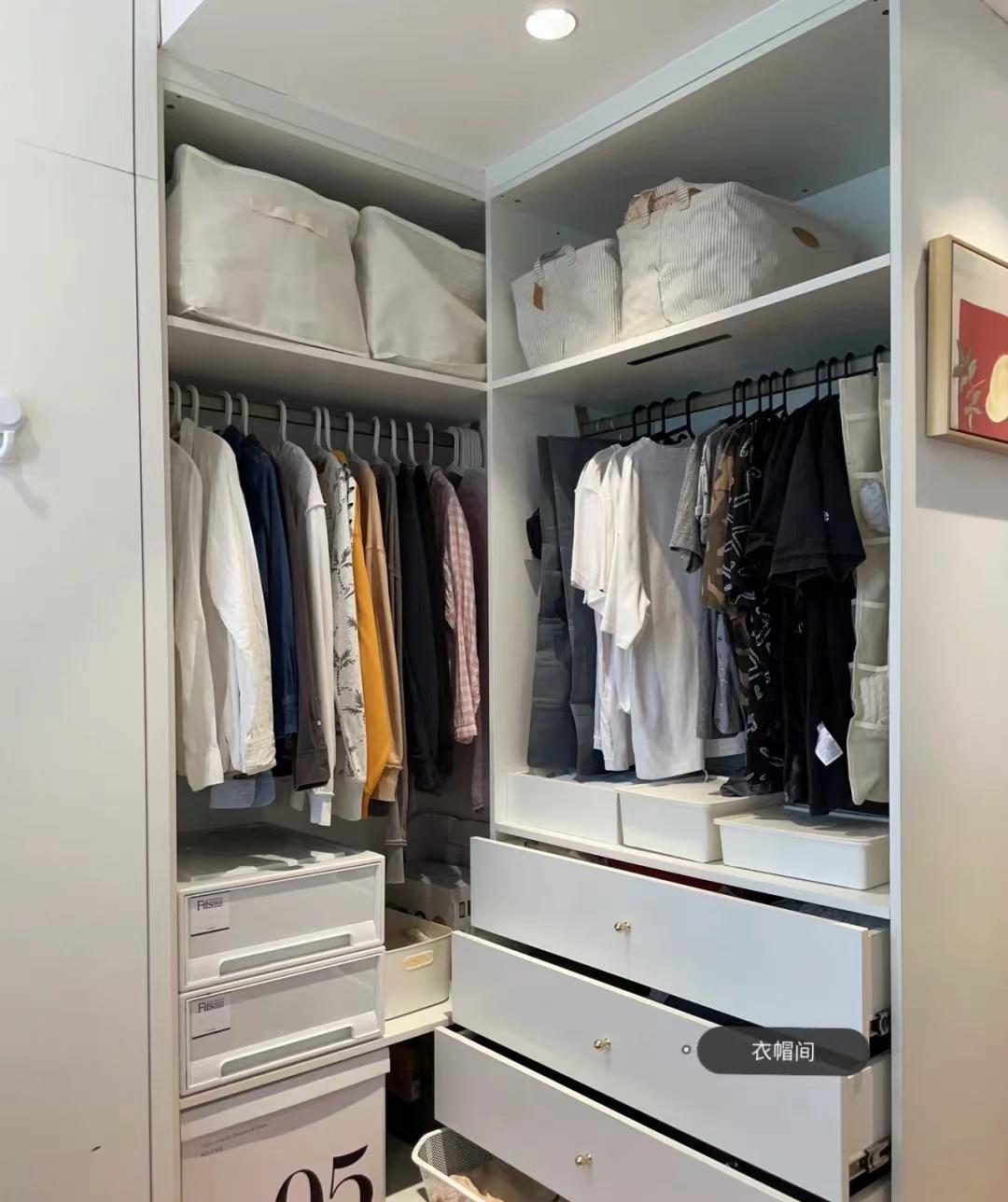 卧室的后面是一个阳台,阳台对着的是外面的消防通道,隐私性不是特别的好,将卧室跟阳台打通,但并不是纳入卧室使用。利用阳台的面积,再从卧室划一点面积过去,做成了一个开放式的衣帽间和书房,然后用衣柜与卧室隔开。这样完美地利用好了阳台,还解决了隐私的问题,书房和衣帽间不需要太过隐私,香格里拉帘的隐私性也还不错。