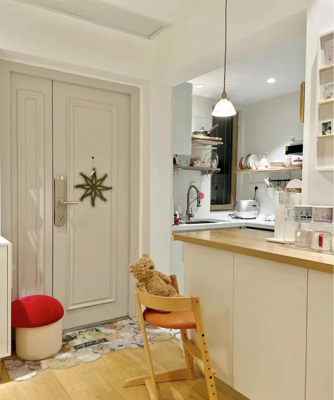 这个房子没有真正意义上的玄关,进门就是餐厅,进门的右侧摆放了一个小的成品鞋柜,上半截的墙面是设计的小隔板,摆上小玩偶和各种颜色的陶瓷水杯,装饰效果很强,鞋柜和小隔板没有占据整面墙,进门往右最里的位置做了顶天离地的收纳柜,用于收纳进出门常用的物品。