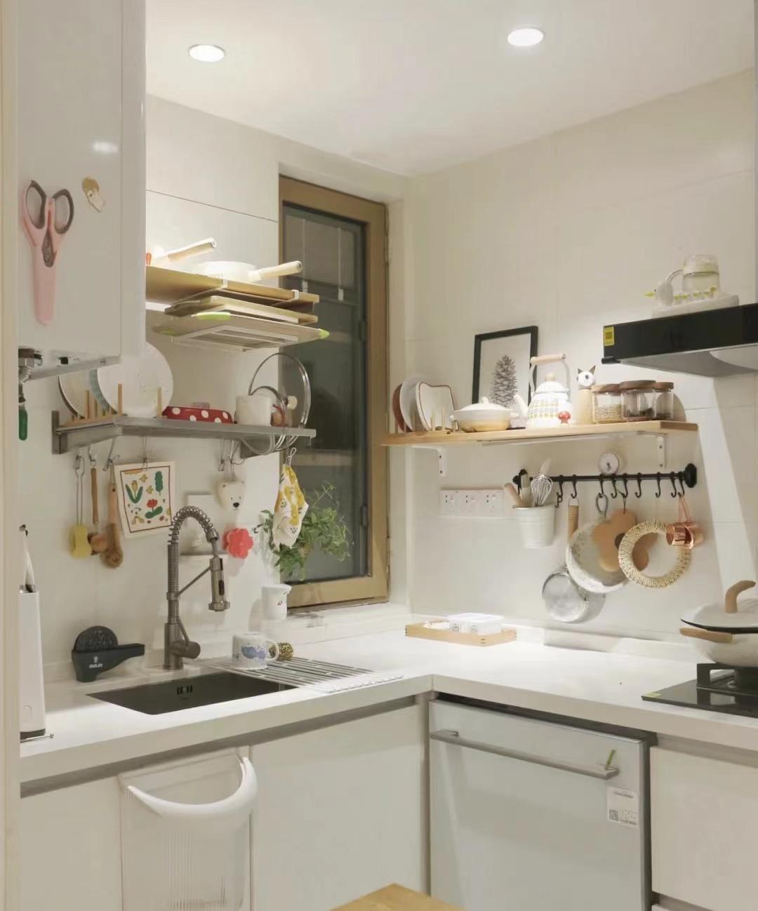 原本的厨房只能做个L型的橱柜,现在做成开放式后,橱柜加上冰箱和过道旁的岛台,不止U字型,可以算是G字型的了,功能面积增加了许多,改造后的厨房已经非常好用了。