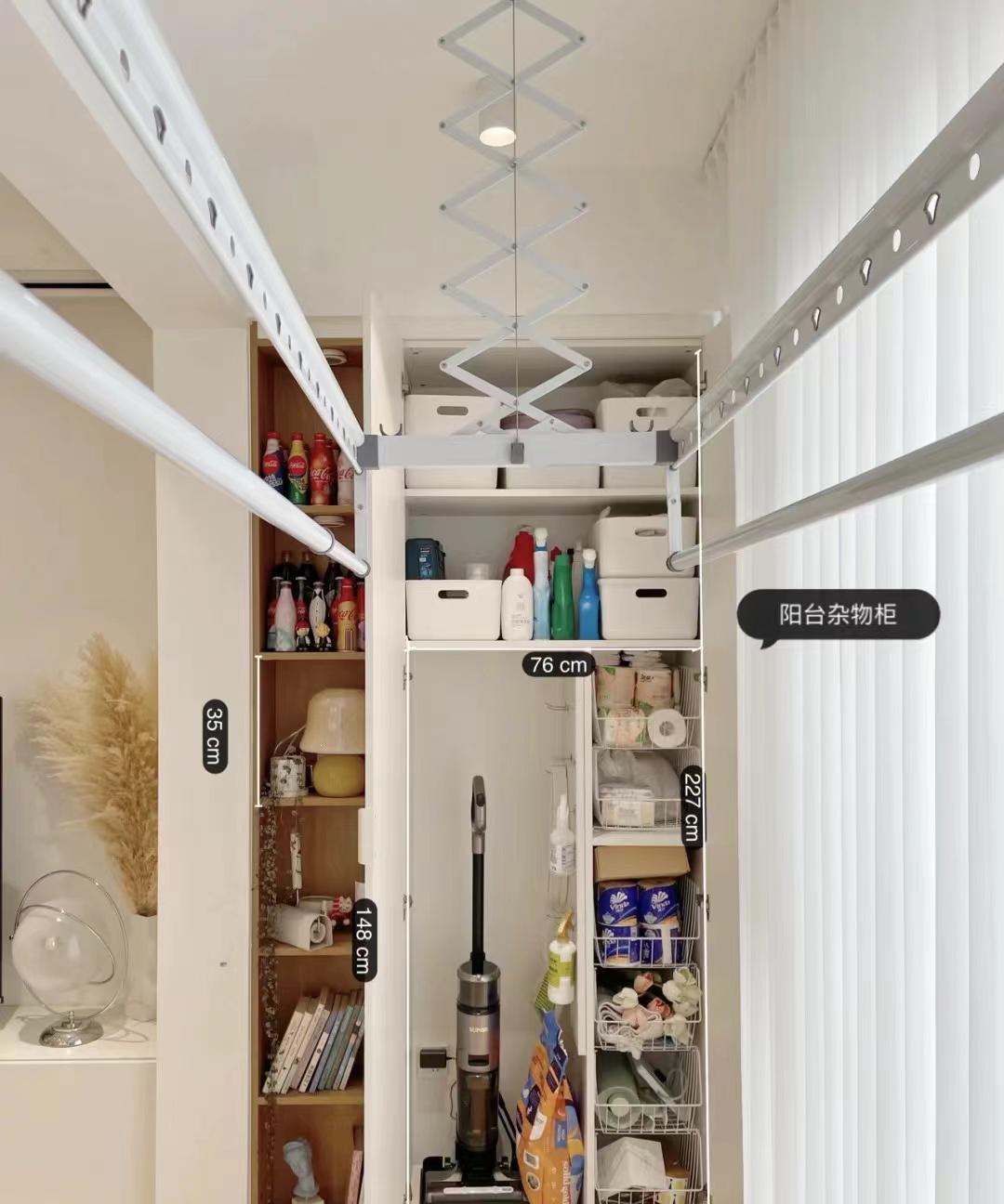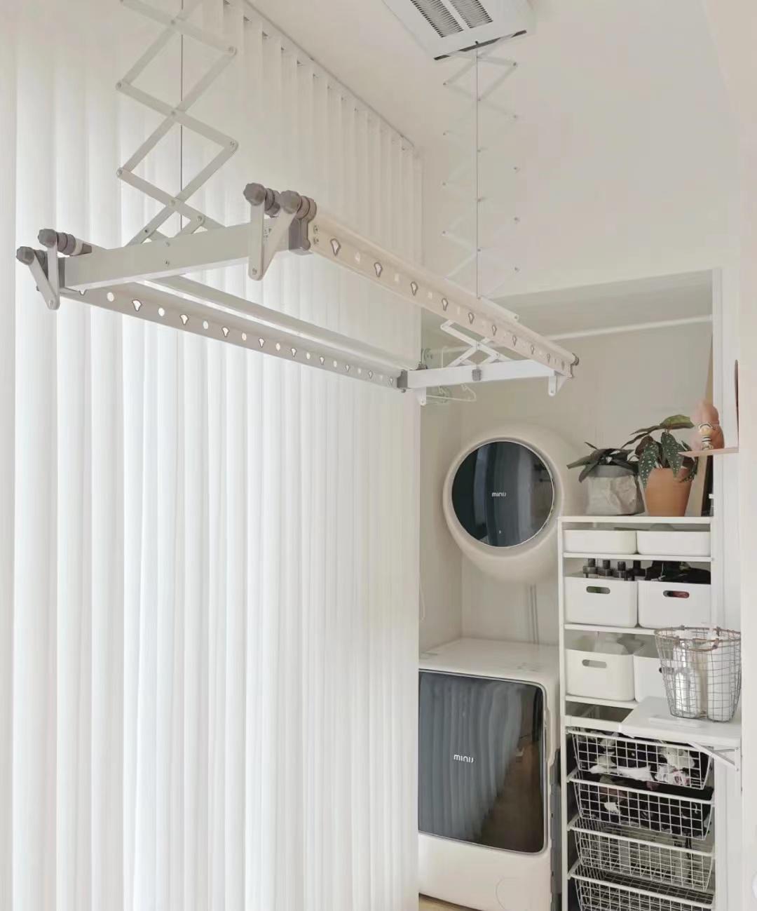 阳台洗衣区四周铺设了瓷砖和单独地漏,没有洗衣池和定制柜体,而是以灵活的可移动开放收纳代替。顶面是可升降的晾衣杆,在需要晾晒衣物的时候降下来,不需要的时候升上去,让阳台更加的美观。