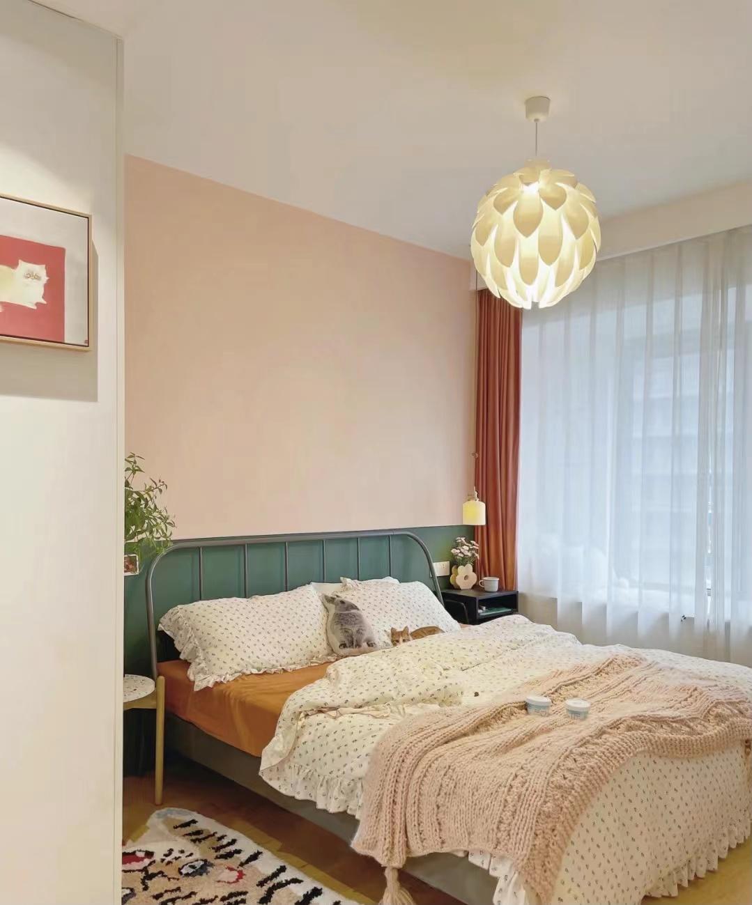 床头背景墙做了撞色的处理,藕粉色和碧绿色的搭配,强烈的对比但又很协调,瞬间提升了卧室的色彩氛围。搭配黑色的铁艺床,田园气息有点浓郁,给人很自然温馨的感受。