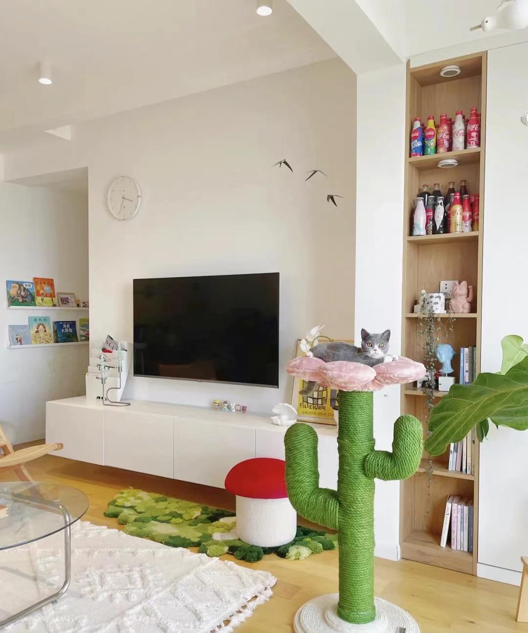 紧挨电视墙那端做了顶天立地的收纳柜,用于收纳平时的生活用品,柜门打开,收纳得满满当当,柜门一关,什么也看不到,在柜门前摆上一个小椅子,可以在这里晒太阳看书。封闭柜子的旁边做了一小列的开放格,用于存放书籍和饮料,在这里不仅可以看书,还有饮料喝。