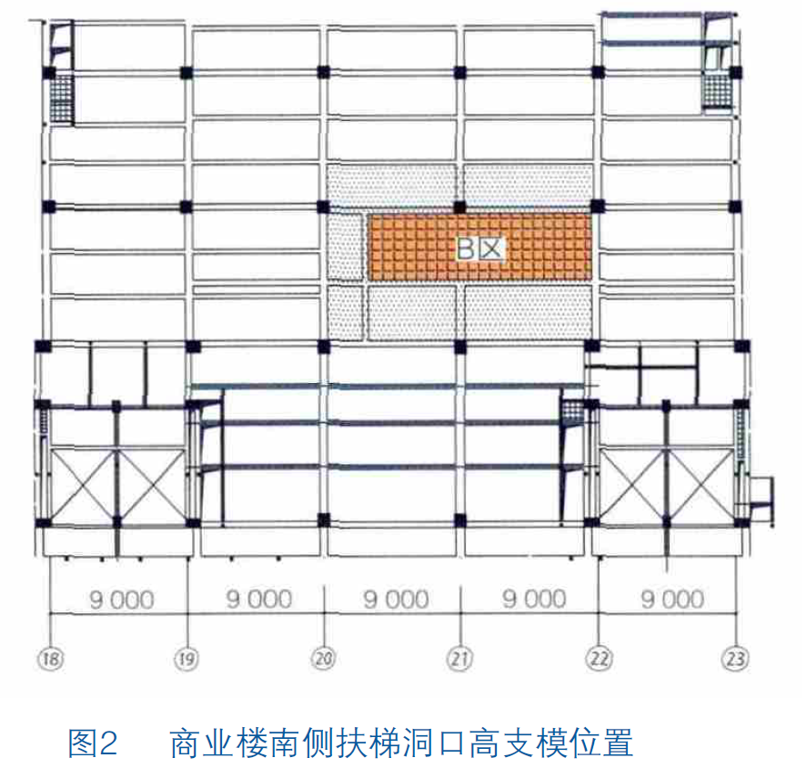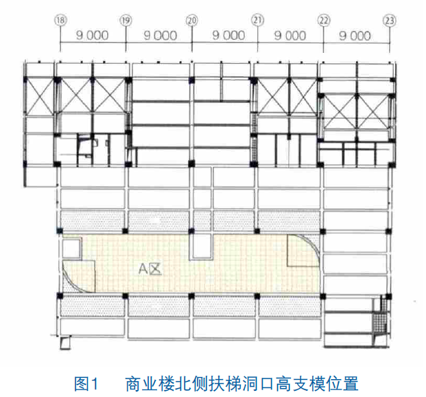 工程高支模部位在商业楼扶梯位置,共2个,一个在商业裙房北侧扶梯大支模区域18~22 轴交AA~W轴,一个在商业裙房南侧扶梯支模区域20~22轴交P ~ L 轴(图1、图2),如采用常规支模方案,则分别从地下1层楼面及顶板搭设支撑至7层屋面,支模高度分别为44.80 m和38.95 m。屋面的结构板厚为150 mm,扶梯洞口最大跨度9 m,长度27 m,又由于屋面为绿化屋面,有覆土荷载,框架梁为600 mm×1 200 mm、400 mm× 1 000 mm,尺寸较大。