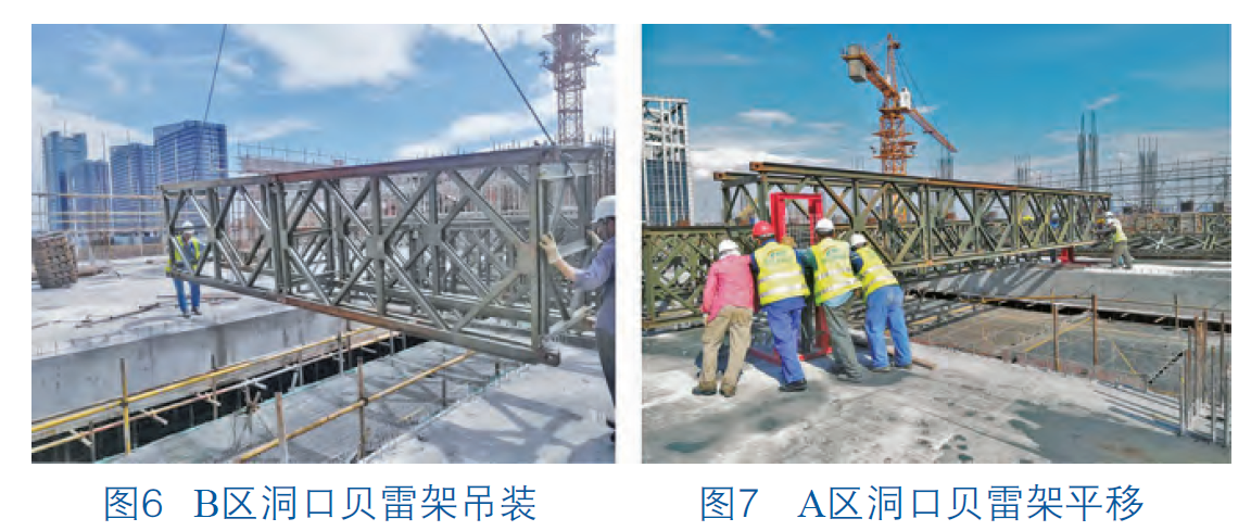 A区屋面施工时,塔吊把单榀最小贝雷架吊至楼面上,在楼面洞口短边方向现场拼装整跨单元架体后,再由液压平移车把整跨单体运至规定放线处;B区跨度小,塔吊起吊整跨在地面组装好的单元架体至规定处,洞口满铺后形成一个整体平台后进行搭设支撑架等下一道工序。
