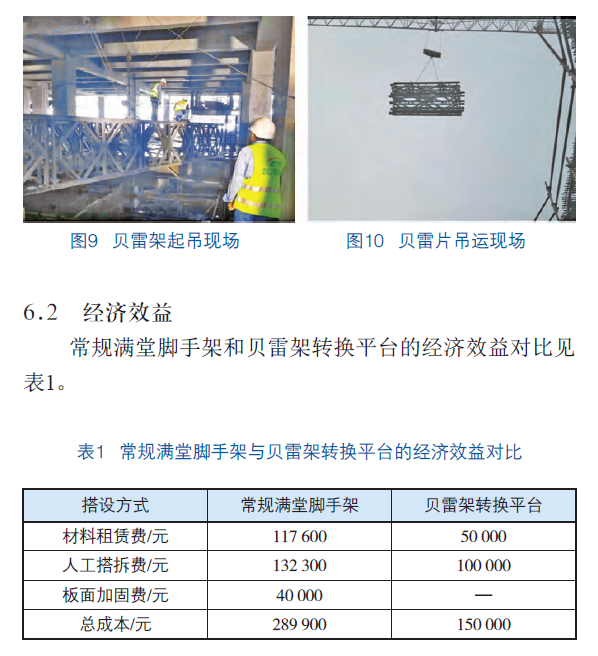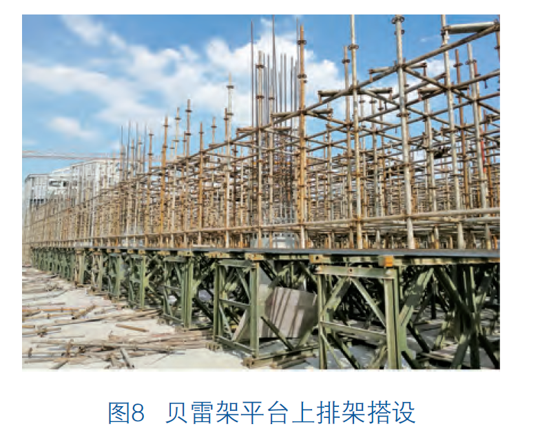 项目采用了贝雷架作为模板支撑体系的平台,在达到施工要求的同时,极大地提高了操作安全性,经济和时间上也都获得了节约,保证了施工进度,同时,具有可周转性,避免了传统采用钢梁作为转换平台时,需要加设拉杆或底部斜撑的工序,对类似工程有较好的参考指导意义。