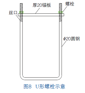 1)U形螺栓选型及预埋。U形螺栓包含2种,一种为固定前端起定位作用的,一种为固定后端起锚固作用的。主要针对固定后端起锚固作用的U形螺栓进行设计计算,保证其抗拔力满足要求,同时留存一定富余(图8)。U形螺栓需布置在主次梁位置,以避免主体结构受损。U形螺栓与主体钢筋绑扎存在交叉作业,需根据现场钢筋实际情况合理安排穿插作业,避免U形螺栓无法安装。安装完成后对U形螺栓的数量、定位、主体加固进行检查,避免后期贝雷架无法安装。
