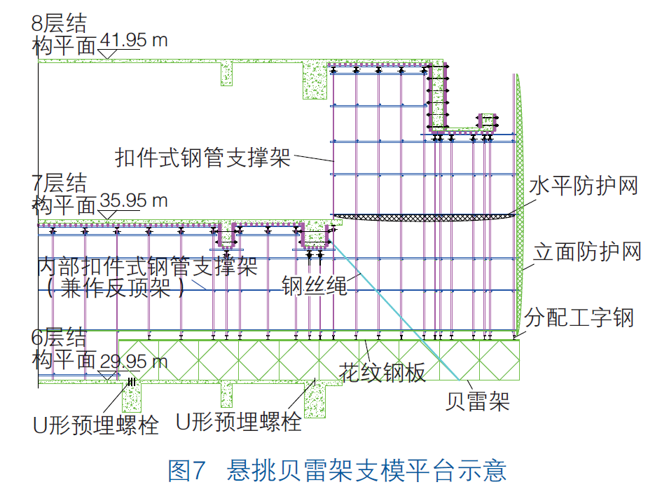 悬挑贝雷架支模平台由贝雷架、花纹钢板、斜拉钢丝绳、分配工字钢、扣件式钢管支撑架、预埋U形螺栓、扣件式钢管反顶架、安全防护设施组成(图7)。