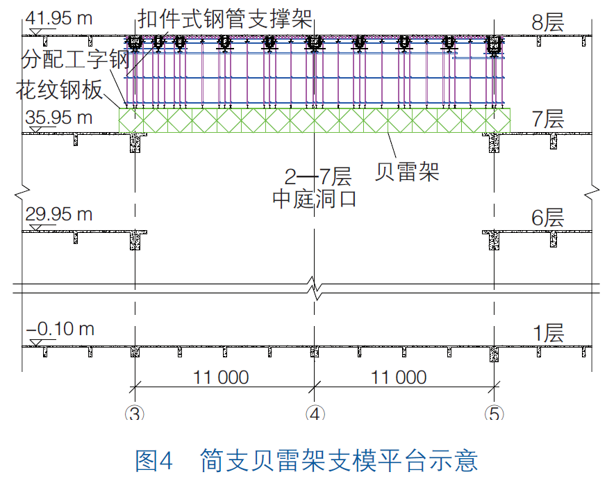 贝雷架体系搭设于施工层下层操作楼面,仅一层的搭设高度,垂直度易控制。