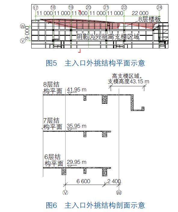 以主入口处挑板为例,1层为地下室室外顶板,标高-1.20 m;2—7层结构内收;8层结构外挑,最大外挑跨度达5.63 m,最大梁截面尺寸400 mm×2 670 mm,标高41.95 m,支模高度达43.15 m(图5、图6)。