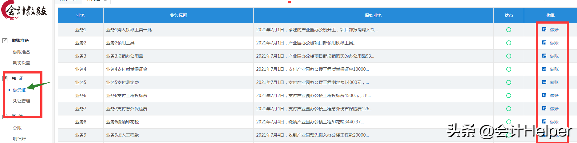 行业账真账实操实训系统是帮助各位会计人员快速上岗的,通过模拟真实企业发生的实际经济业务能够帮助各位会计人员理解掌握日常的做账报税流程,高效地处理财税工作。亲自练习每笔业务做账的界面如下图所示:点击做账即可亲自练习做账。