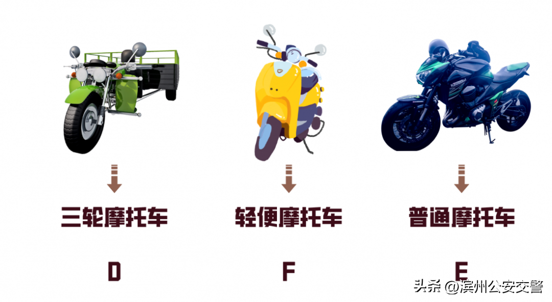 摩托车驾驶证分为普通三轮摩托车驾驶证D证、普通二轮摩托车驾驶证E证和轻便摩托车驾驶证F证。
