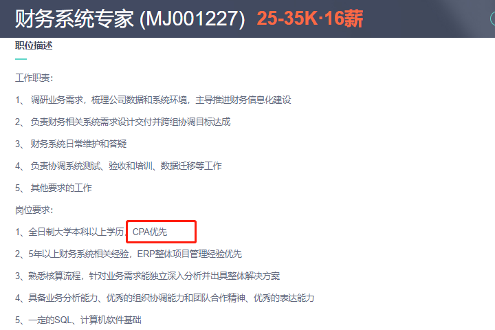 在相关专业的就业岗位中,对面试者当然是有一定的门槛要求,其中一项就是证书。例如以下岗位招聘中我们会清楚看到“CPA证书优先”的字样:
