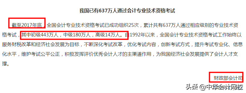 2、而早在2018年1月份,财政部曾公布:截至2017年底,全国会计专业技术资格考试已成功组织25次,累计共有637万人通过相应级别的专业技术资格考试,其中初级443万人,中级180万人,高级14万人。