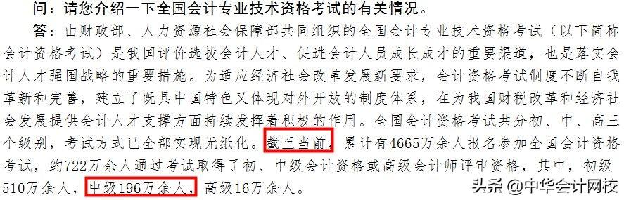 1、2018年中级考后,在《2019年度全国会计专业技术初级资格考试有关问题答记者问》中,财政部公布:截至当前,累计有4665万余人报名参加全国会计资格考试,约722万余人通过考试取得了初、中级会计资格或高级会计师评审资格,其中,初级510万余人,中级196万余人,高级16万余人。