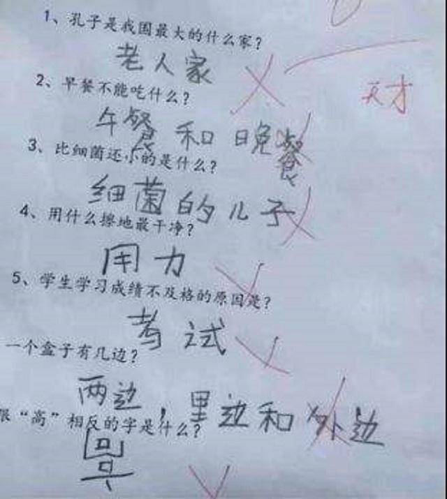 虽然看似简单有些耍小聪明的感觉,然而你找不到给他打错的理由,就只能给小朋友的机智点赞了。还有一些歇后语的填写,不知小孩子哪里来的思路,让所有的题目都完整的作答,然而在老师判卷子的时候让人哭笑不得,就拿床前明月光,后半句被孩子写成李白睡的香,看似押韵是个好句子,然而和答案相差甚远。
