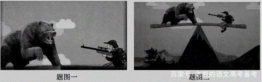 材料二是央视2019《主持人大赛》选手抽到的两幅图。图一是一只凶猛的熊虎视眈眈地看着朝它举起枪的猎人,看起来,人类面对动物有着生杀予夺之权;图二揭示了这幅图的全貌——这只凶猛的熊和举着枪的猎人同时处在跷跷板的两端。不难想见,熊在这里象征着大自然,举着猎枪的人象征着作为食物链顶端的人类。这幅图揭示了人和自然的本质关系——统一对立(图二);而很多人由于视野的狭隘,思想的局限,并不能认清楚这个关系(图一)。