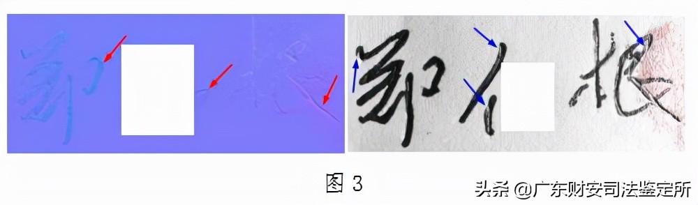 经使用RTI智能光源仪对借款人处需检的“郑某根”签名字迹进行检验,发现:“郑某根”签名字迹的正面有明显的压痕(如图3中红色箭头所指),且笔画压痕与笔画墨迹的分布位置存有异常(如图3中蓝色箭头所指)。