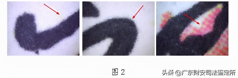 经使用体视显微镜对借款人处需检的“郑某根”签名字迹进行放大检验,发现:“郑某根”签名字迹的笔画系由黑色墨粉颗粒堆积而成,有明显的层次感,笔画边缘伴有离散状的黑色墨粉颗粒,空白处分布有黄色小点,且“根”字右半部分的红色指印亦是由彩色杂点堆积而成。如图2所示
